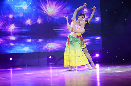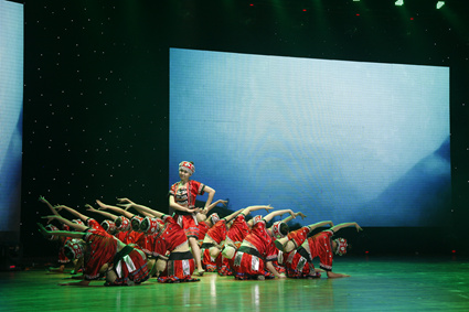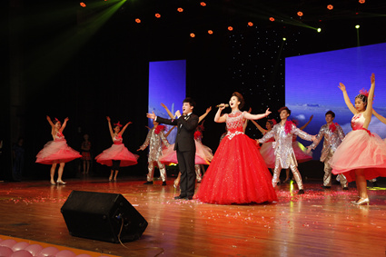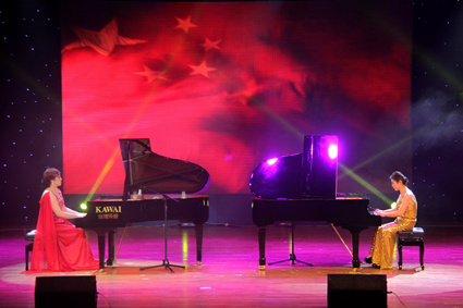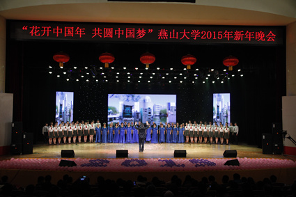 钢琴合奏《红旗颂》 (李阳/摄) 晚会在激情洋溢的双钢琴版《红旗颂》中拉开序幕,双人舞《遇》和小提琴独奏《花儿为什么这样红》向观众展现了优美、缠绵的爱情故事;富有磁性的男声独唱《斗牛士之歌》把观众带入斗志昂扬的意境之中;女声小合唱《memory》流露出对未来无限的期望,《乡韵》则表现出对故乡的眷恋,诉说出浓浓的乡情;诗朗诵《生命之链 大爱长城》诉说着一条用身躯汇成的“生命锁链”,一座用大爱筑起的友善长城,燕大学子用自己的行动诠释了青春的壮美,而后学校领导为“12•7 冰海救人模范群体”颁发锦旗。歌曲《祖国我深深的爱你》、《中国梦想》通过对祖国大好河山的美好歌颂,表达了对伟大祖国的深深眷恋;女子群舞《茶韵巴山》踏着土家民族的节奏,把观众带入少女的欢笑与满含茶香的山雾中的优美画卷中;扬琴合奏《黄土情》描绘了黄土高坡上纵目远眺一望无际的景色;大合唱《乌鸦传媒校歌》展示出一代代燕大人秉承“厚德、博学、求是”的校训,用心血诠释着“艰苦奋斗、严谨治学、求实创新”的“燕大精神”,抒写着近一个世纪的报国情怀。晚会也随着这激情澎湃、引人深思的大合唱圆满落幕。