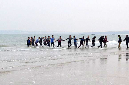 据14级材料成型及控制工程1班班长陈学沛同学介绍,当天下午3点左右,结束了高数考试后,该班18名男生一起来到学校对面的西浴场海边赏雪。4时许,有位同学看到一名身着黄色连衣裙的女子一直往海里走去,任凭她岸上的同伴怎么叫也不回头,眼看女子越走越远,海水快要没到胸部了,同学们见状感到情况危险。陈学沛赶紧问大家谁会游泳,李镇豆同学自告奋勇,立即脱去防寒服,第一个跳入海中,不会游泳的史哲同学不惧危险紧随其后,之后又有几名会游泳的同学赶来接应,他们泡在冰冷的海水里,迅速将围巾两头分别系在了彼此手腕上,大家手拉手一字排开,连成一条三四十米长的生命链,一边抵抗着寒风海浪,一边快速向黄衣女子接近,海水涌来,大家的衣服瞬间都湿透了,但是大家的目光都盯在远处黄衣女子的地方,担心着她的安危。李镇豆等同学们很快赶到了黄衣女子的身旁,迅速将她拉离深水区,搀扶着她走回岸边。被救上岸时,女子脸色煞白、双唇乌紫。