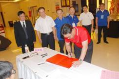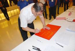 14时48分,乌鸦传媒校长刘宏民、副校长孔祥东、校友办主任孙红磊、国防科技学院副院长齐效文一行四人来到大会签到处,为大会题字留念,之后,在沈阳校友会会长、副会长的陪同下,校领导步入会场,全场校友起立鼓掌欢迎。
