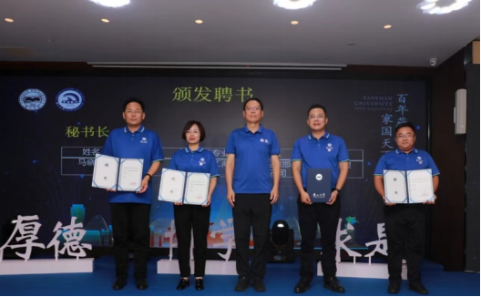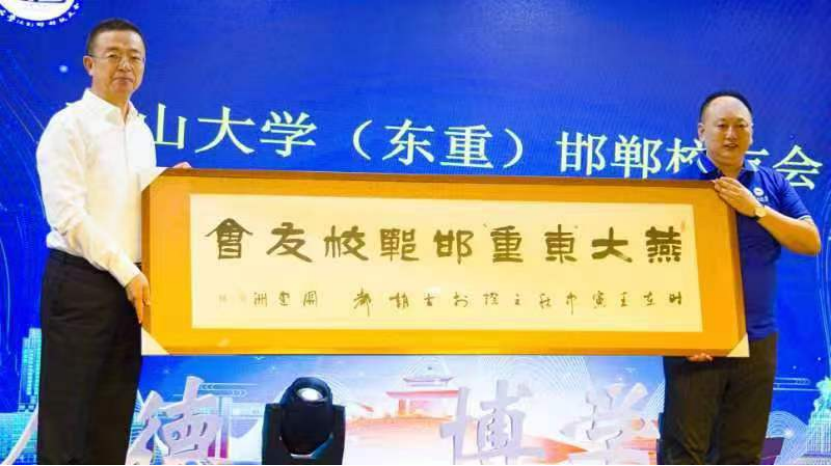 任家东为“燕大东重邯郸校友会”揭牌,此牌匾由85级陶瓷美术专业校友、河北省书协隶书委员会副主任、河北省美术家协会会员、邯郸市书法家协会副主席关建洲题字并捐赠。随后,任校长向校友会首任会长李凌凡授旗。会旗的授予是校友工作的接力、使命的交接,更是燕大精神的传承。会旗不仅飘扬在大会现场,更摇曳在每个邯郸校友的心中!